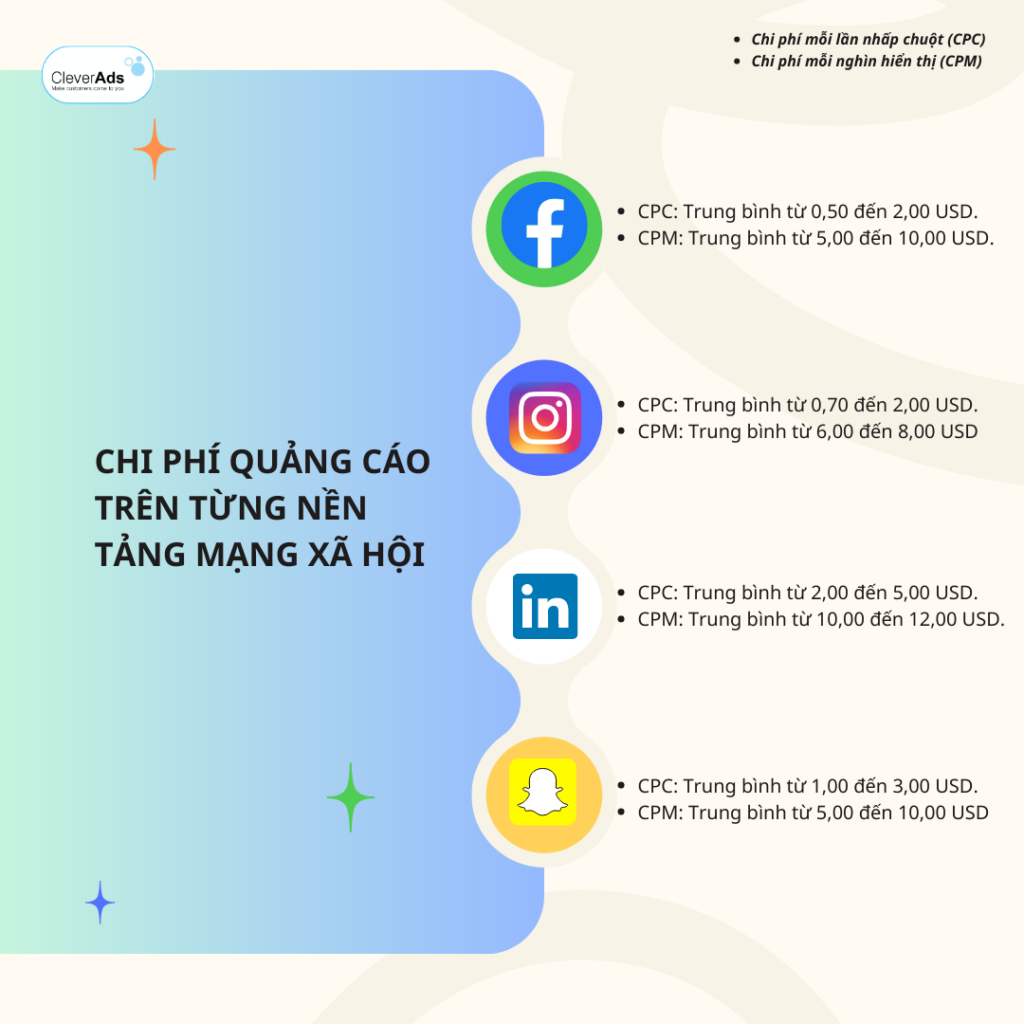 Các chi phí quảng cáo trên mạng xã hội có thể thay đổi tùy thuộc vào nền tảng và các yếu tố khác nhau như mục tiêu tiếp thị, đối tượng mục tiêu, kích thước quảng cáo và đối thủ cạnh tranh.